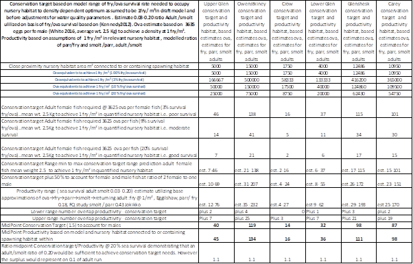Table 2 Trial reconciliation of a conservation target range with estimated productivity range. The number of adult fish required to fill close proximity nursery habitat the guide target productivity potential of 1.0 /m² using the assumption that between 3 and 20% of ova will survive (Kennedy 2012). Each female fish is assumed to carry 3635 ova (White 2016) (average weight of 2.5 Kg pers.comm Ballycastle angling Club) average catch weight), and using a weight ova calculation from White 2016. The survival of ova to fry is estimated at fry/ova ratio of 0.03- 0.20 (Kennedy 2012) from the river Bush Northern Ireland which is a spatially close index river with similar river characteristics and is used to estimate a range for conservation limit requirements. Habitat based conservation target of ranges are achievable with smolt/parr ratio of 0.02 sea survival assuming juvenile habitat based survival life cycle survival. According to selected juvenile productivity parameters habitat a sea survival ratio of adult /smolt of 0.2 would secure achievement of conservation target. Sea survival >20 % is required for harvestable surplus. Subsequent adjustments may be needed to adjust for water quality parameters effecting survivability